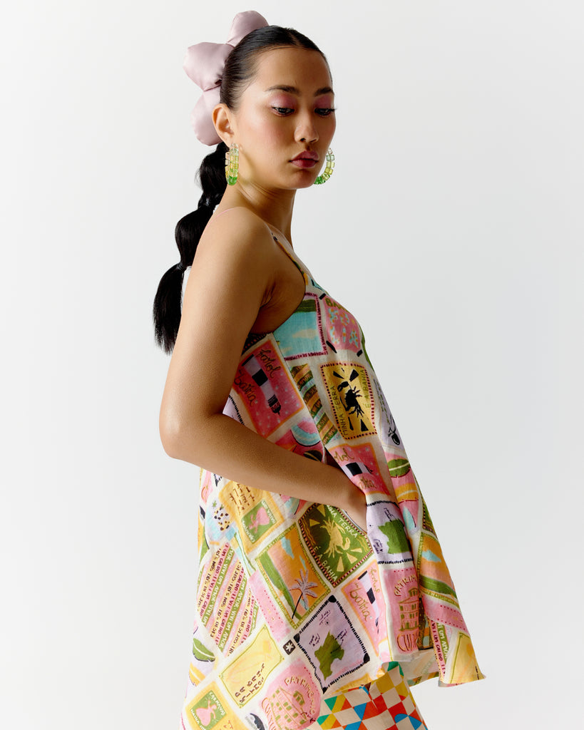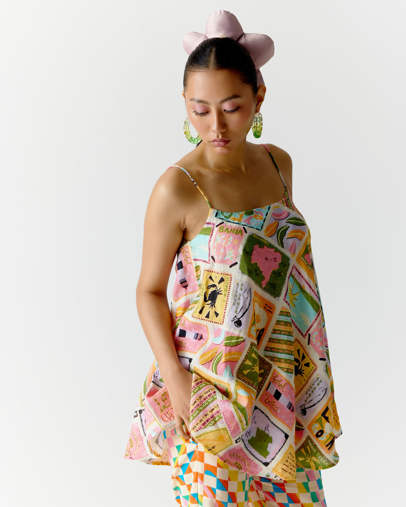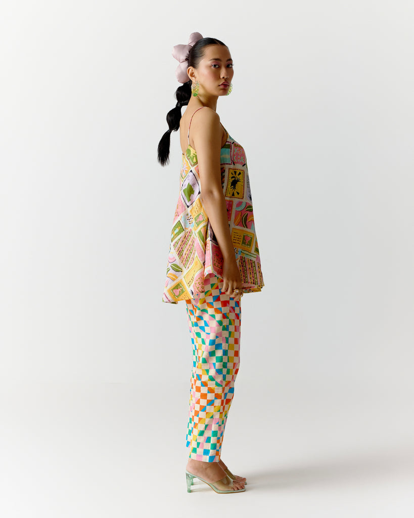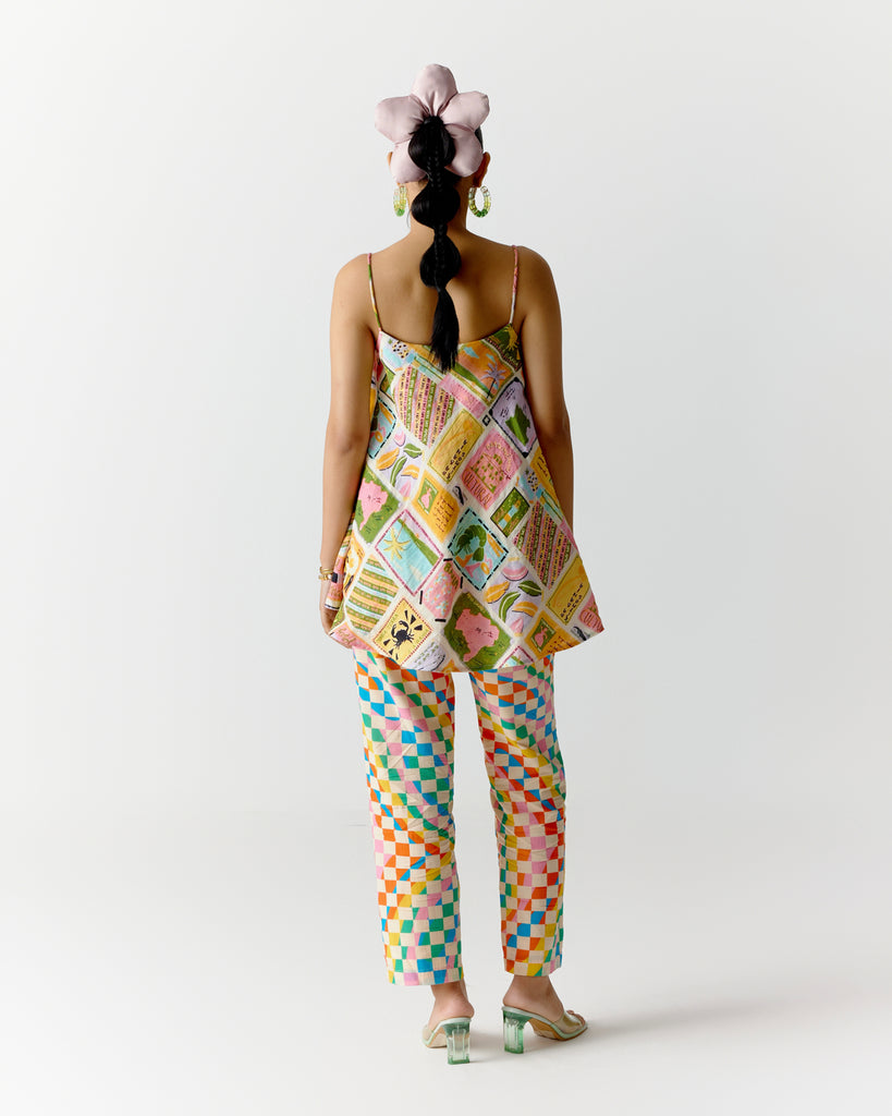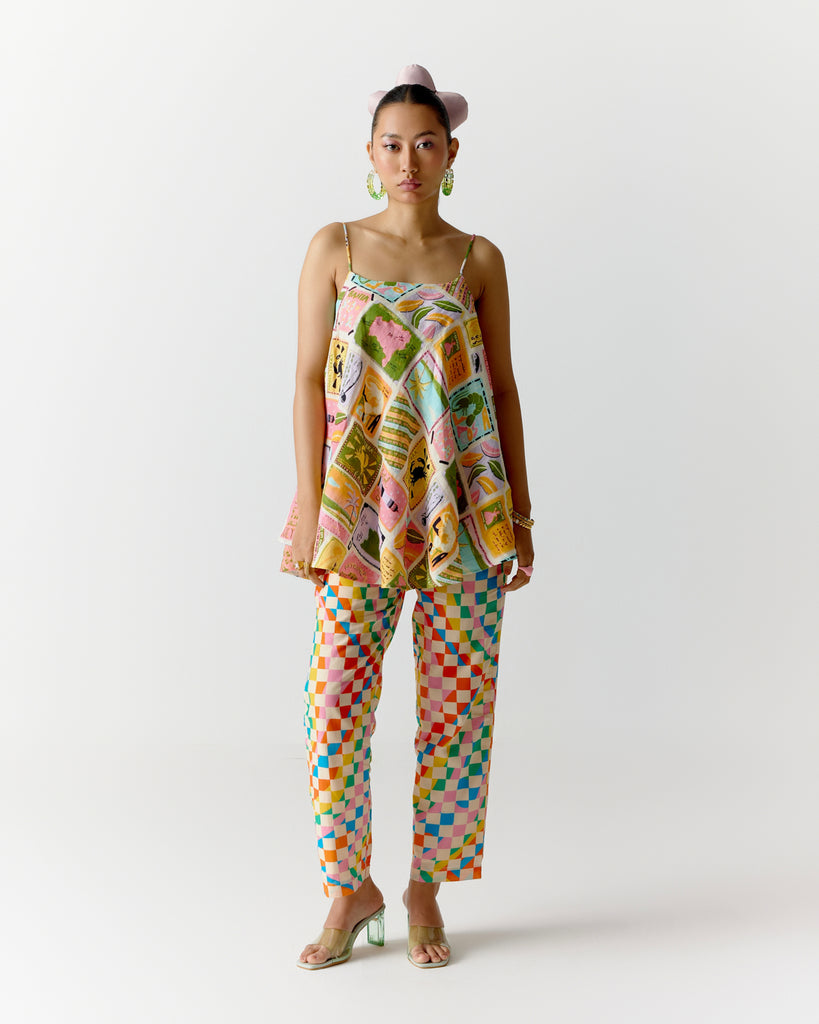 The Bahama Circle Top features a loose, draped silhouette with soft curves and a relaxed fit that moves with you — airy, minimal. It pairs seamlessly with the color square tapered pants, designed with a vivid geometric print and a tailored cut that narrows at the ankle, striking the perfect balance between comfort and edge.