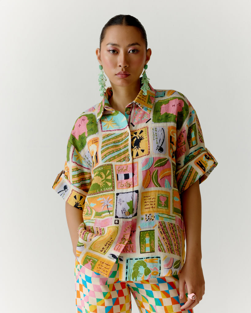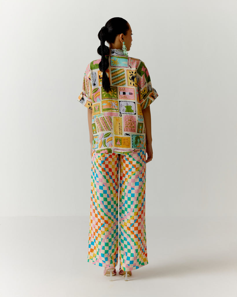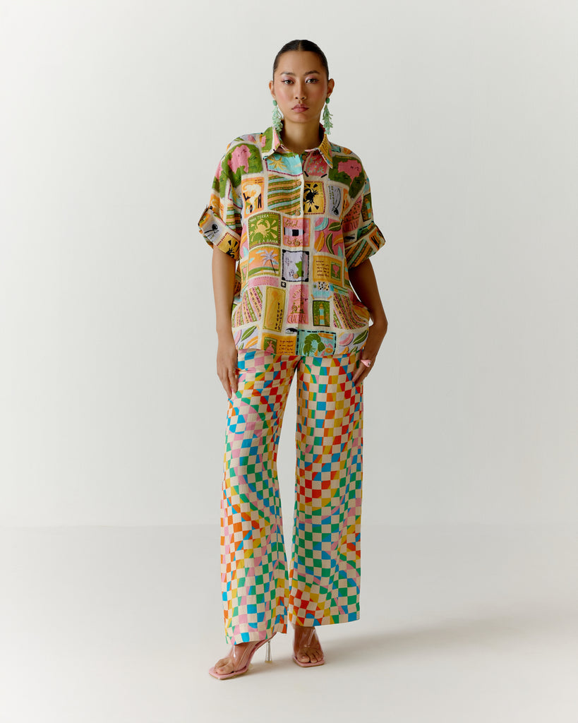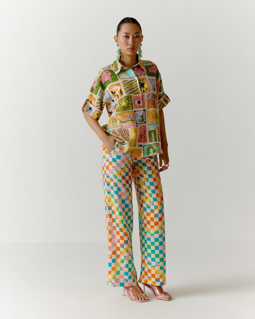 The Bahama shirt features a breezy fit, button front, and roll-up sleeves with tab closures — perfect for switching between laid-back and polished. The statement pants are the star of the set, featuring a bold color square pattern that pops with personality. Designed with a relaxed wide-leg cut and a comfy elastic waistband, they deliver comfort without compromising on style.
