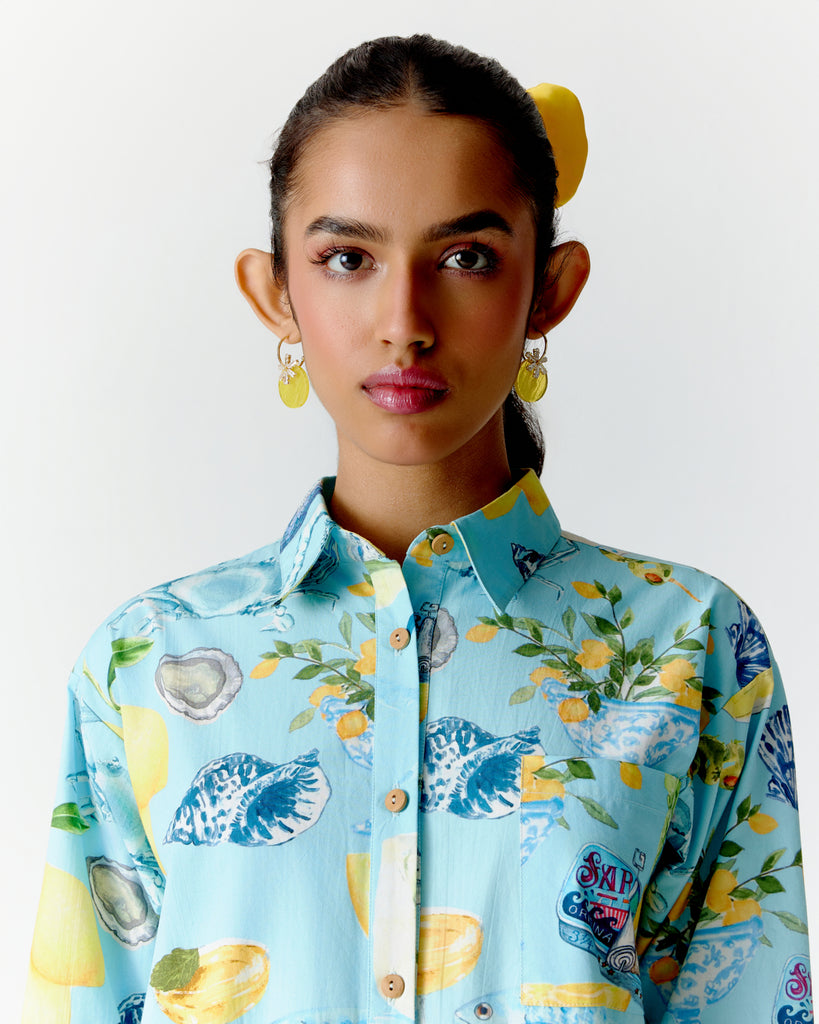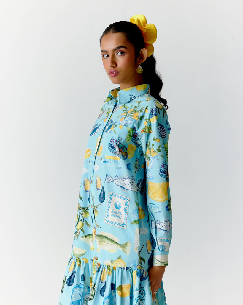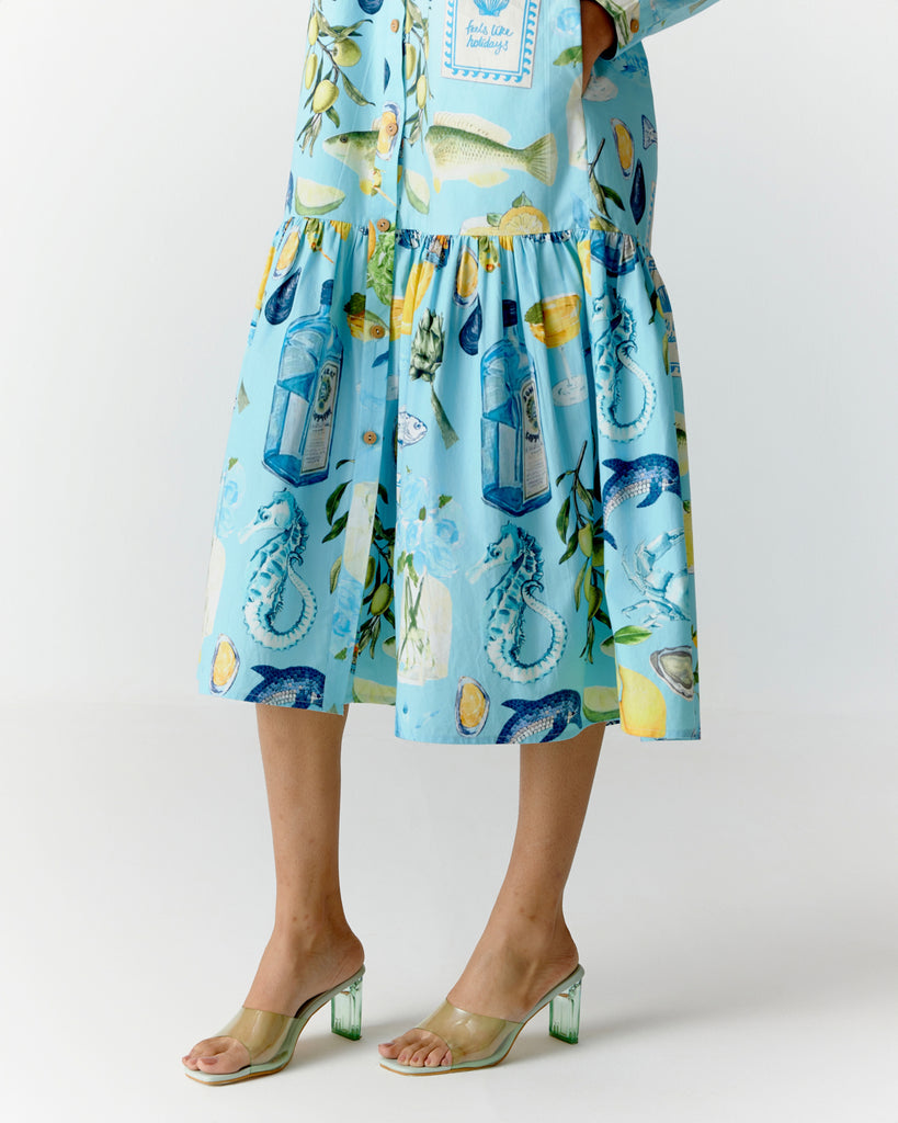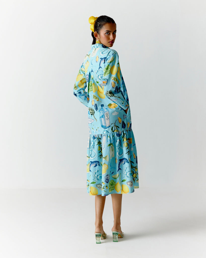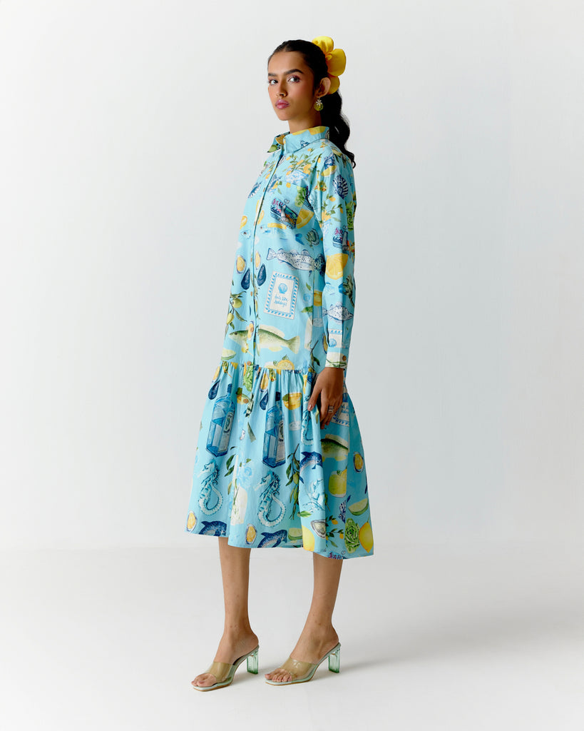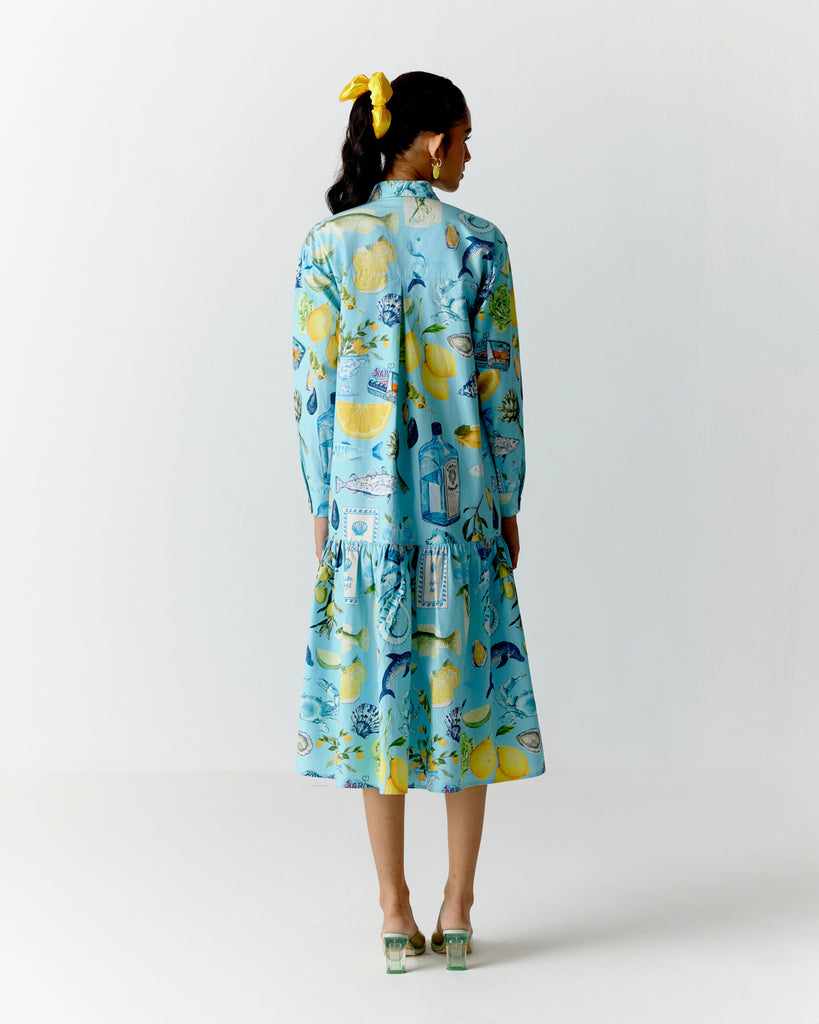 The Shirt Dress is a laid-back yet polished look. It provides all-day comfort while giving a very fun and put together appearance. The structured shirt design features a crisp collar, button-down front, and a flattering silhouette that can be cinched at the waist with a belt or left loose for a more relaxed and effortless vibe. The clean lines offer a timeless appeal, while the deep blue hues add depth and allure.