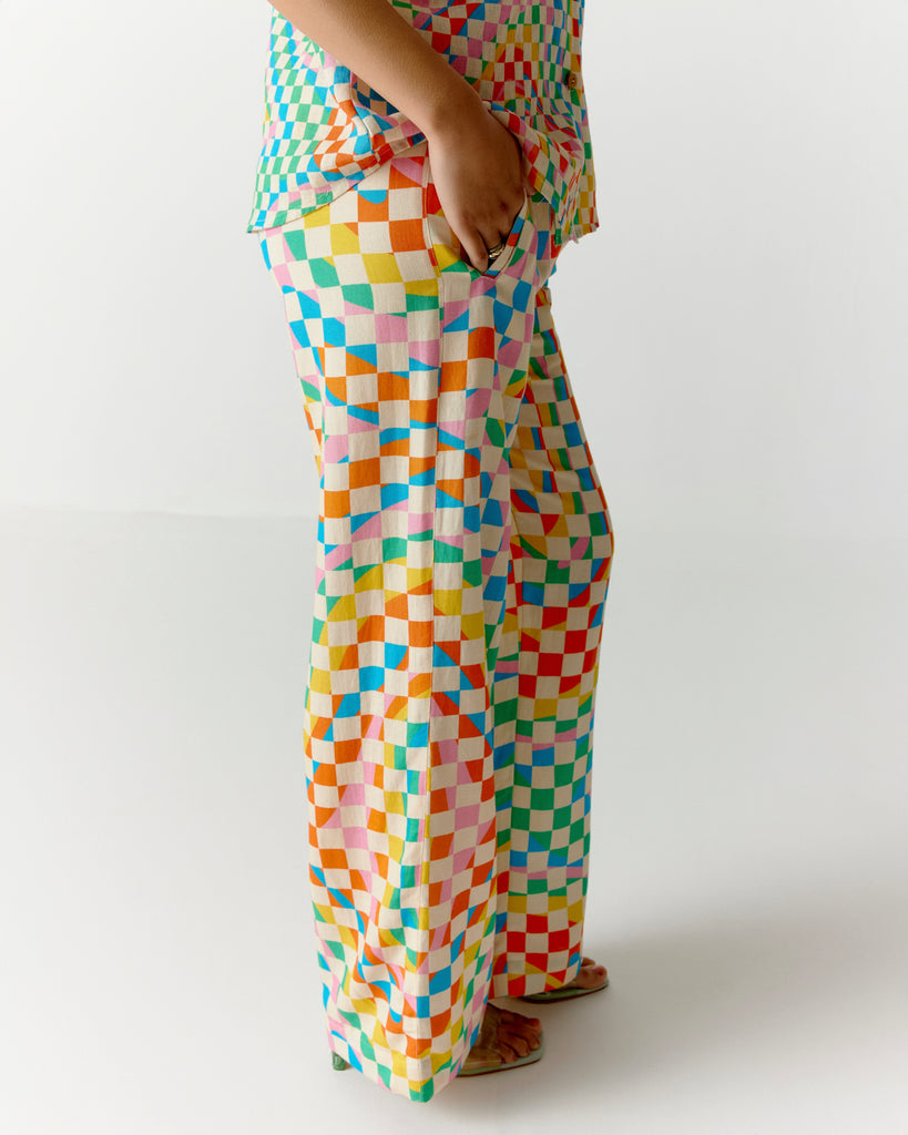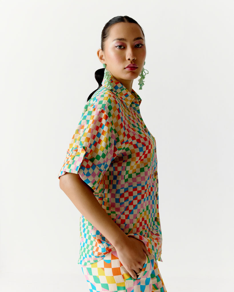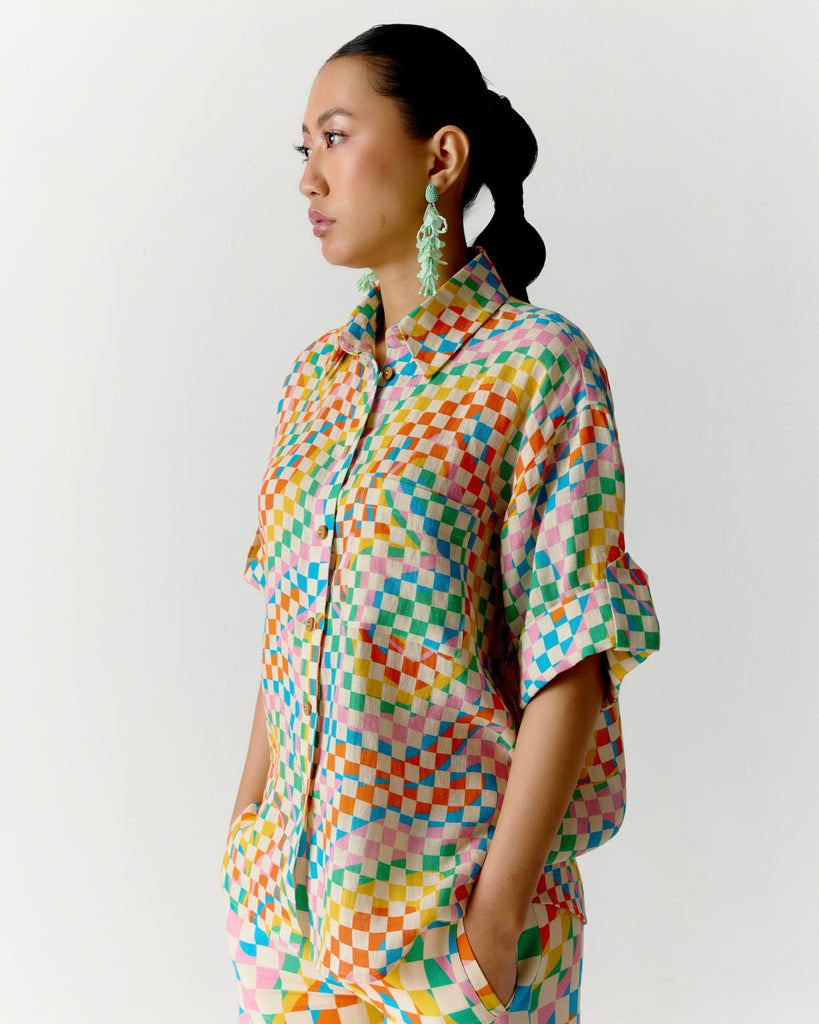 The Color Square Roll-Up Sleeve Shirt and Pants set is a vibrant, coordinated outfit that blends comfort with bold, modern style. The shirt features a colourful square or checkered pattern—often a mix of bright or contrasting tones that create a lively, eye-catching design. It comes with roll-up sleeves, secured with button tabs, adding a practical and relaxed touch.The fit is typically relaxed or slightly tailored, offering comfort without sacrificing shape. Paired with matching or complementary pants, straight-leg, the ensemble feels put-together yet easygoing. Made from lightweight linen, this outfit is perfect for daytime outings, creative work environments, or travel—anywhere you want to look stylish while staying cool and comfortable.