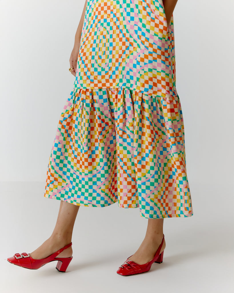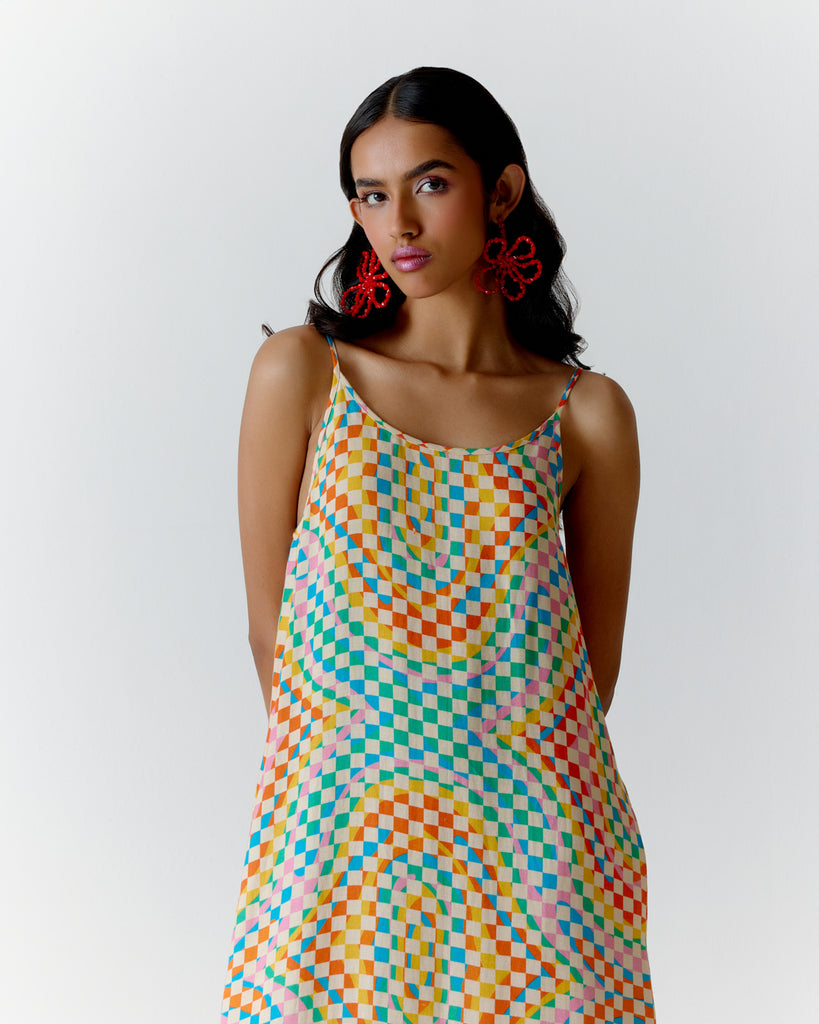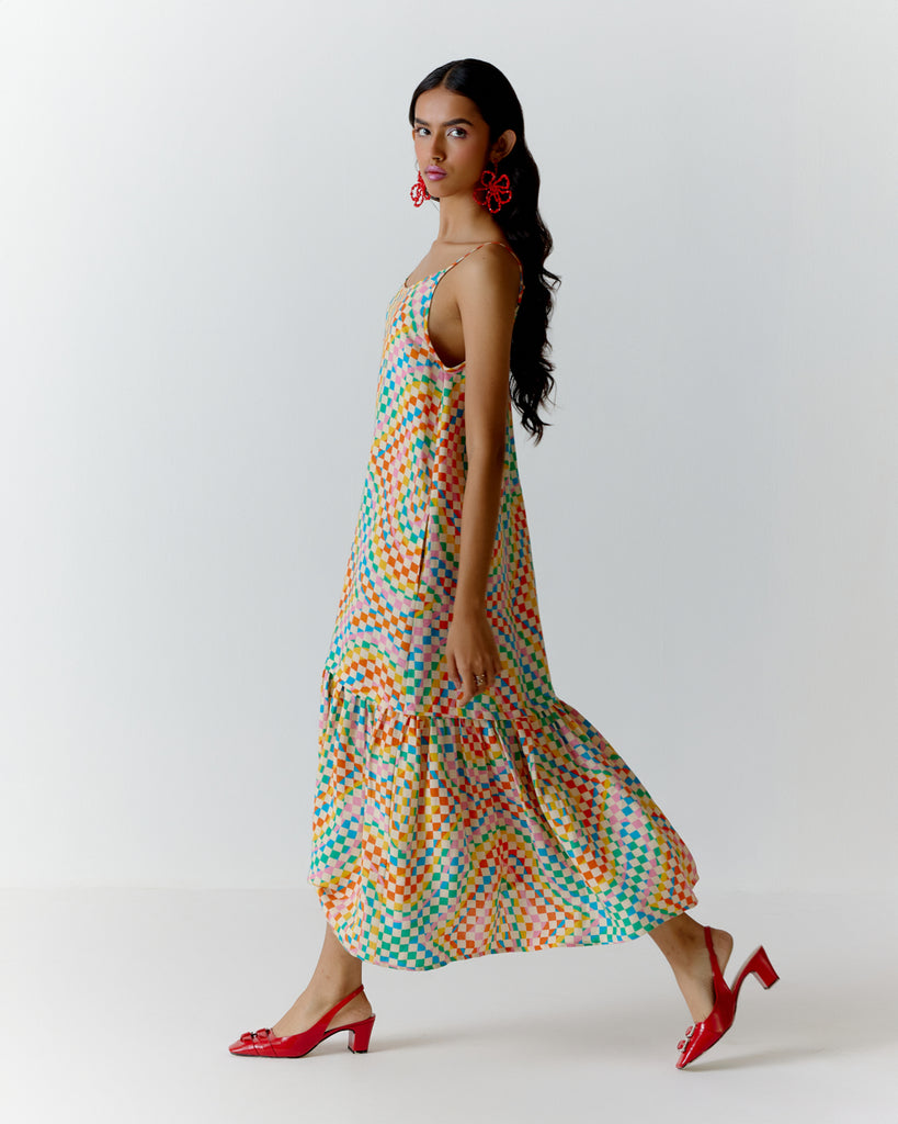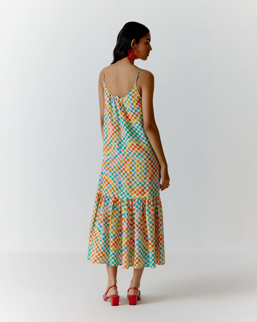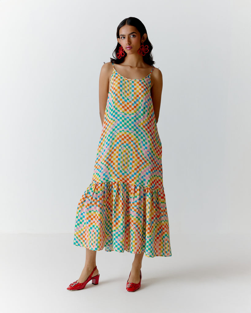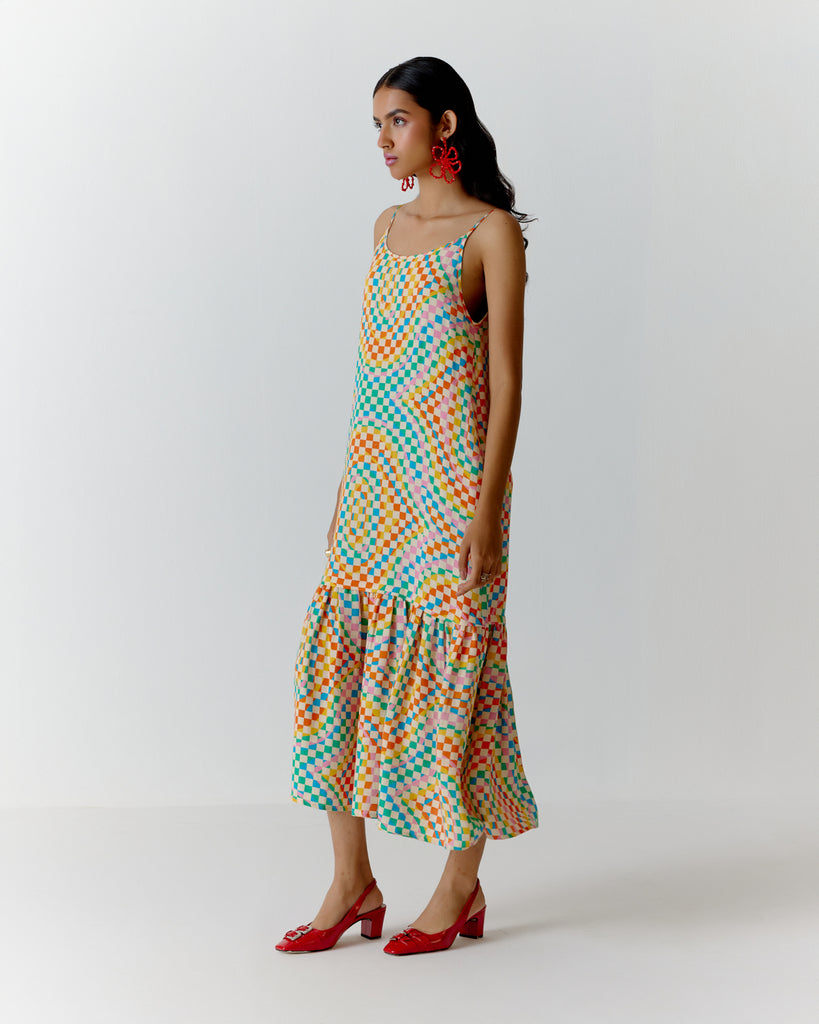COLOR SQUARE SPAGHETTI FRILL DRESS