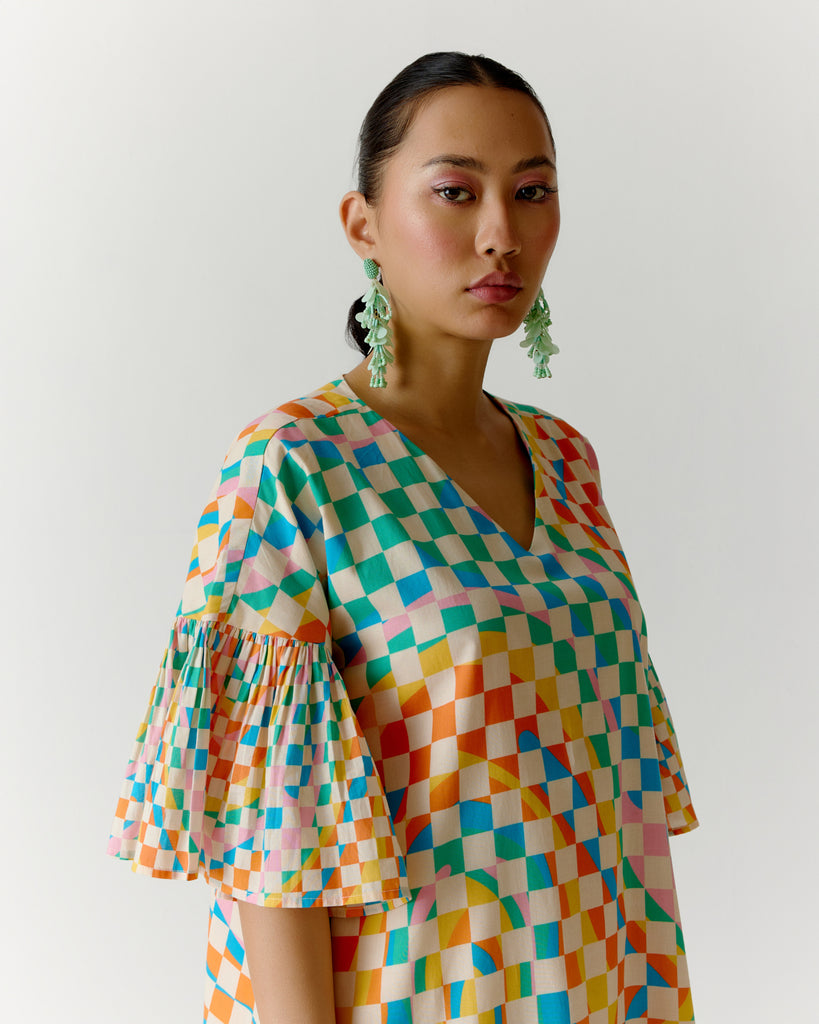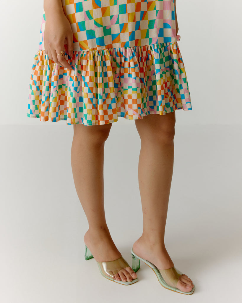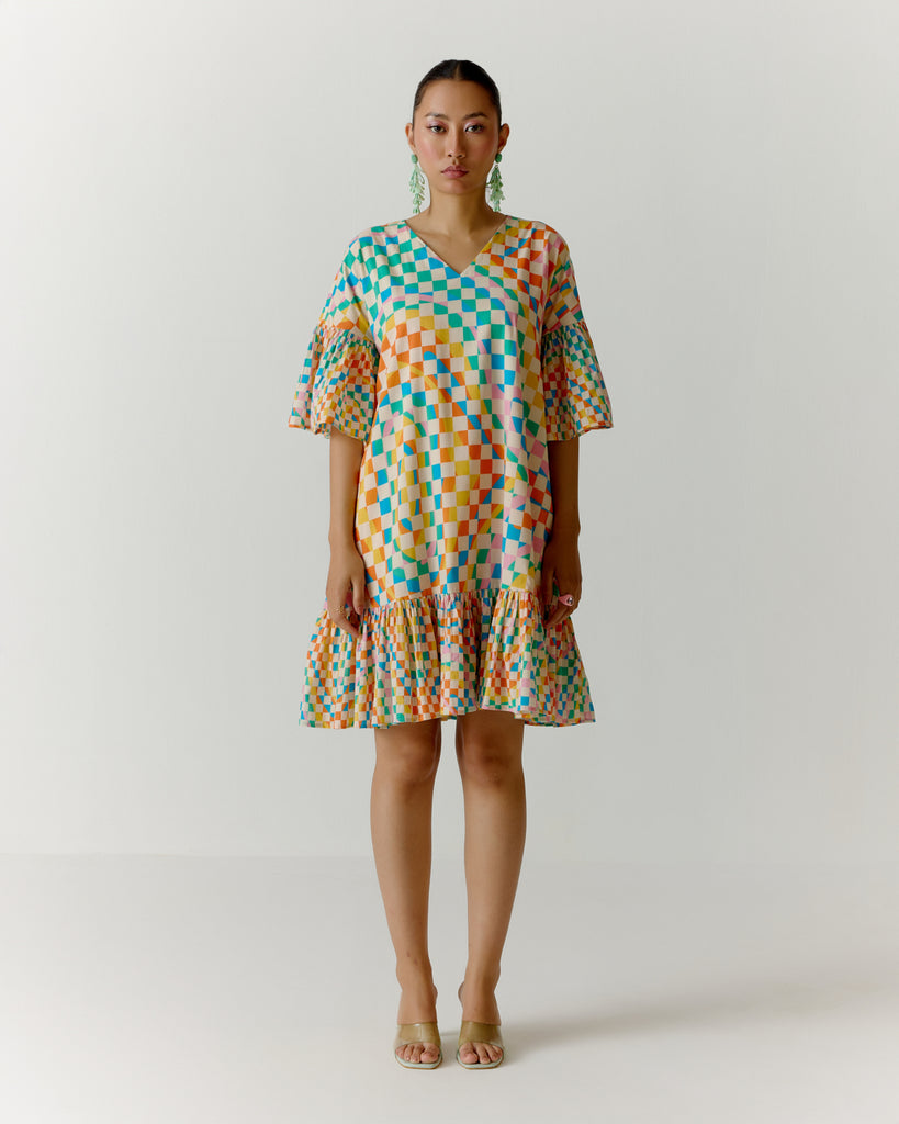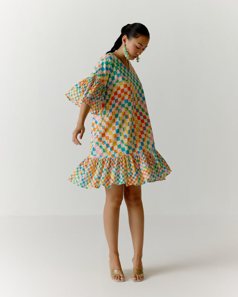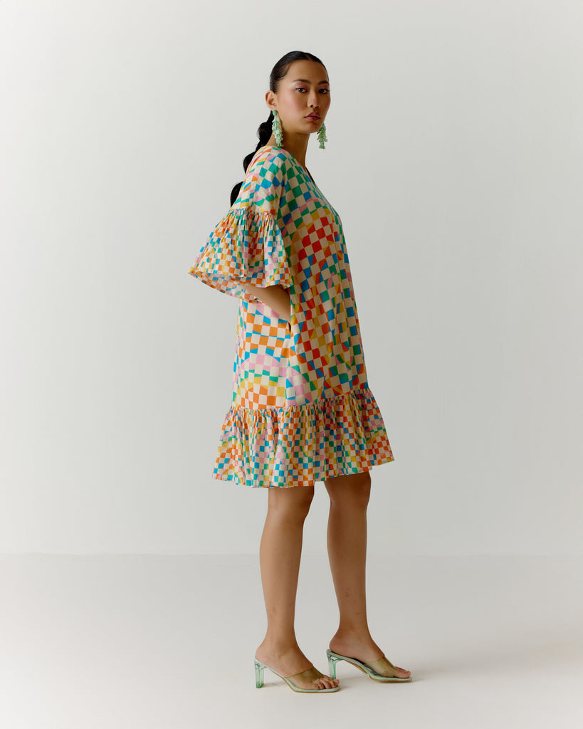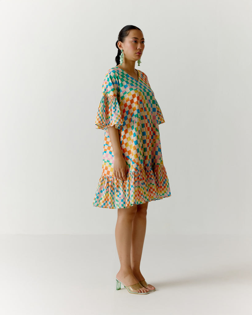 COLOR SQUARE RUFFLED SLEEVE DRESS