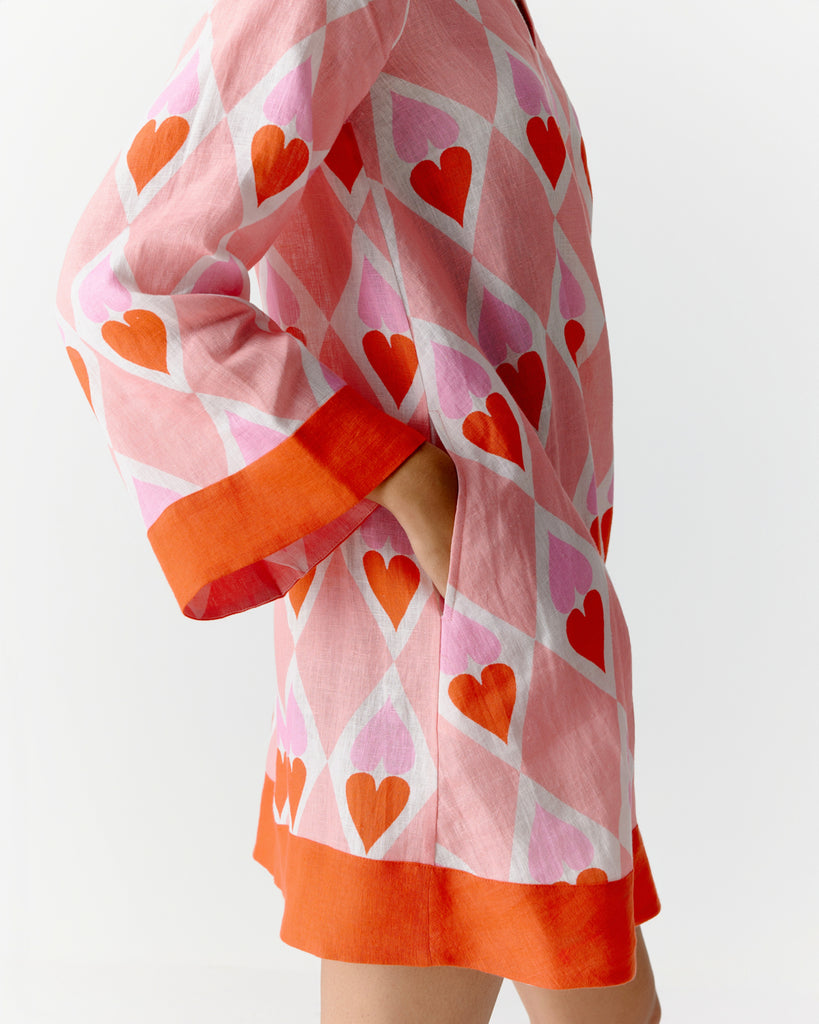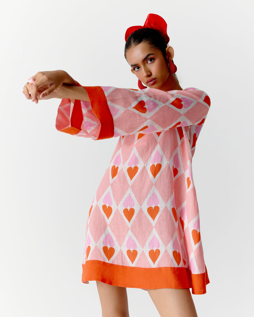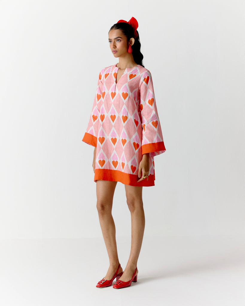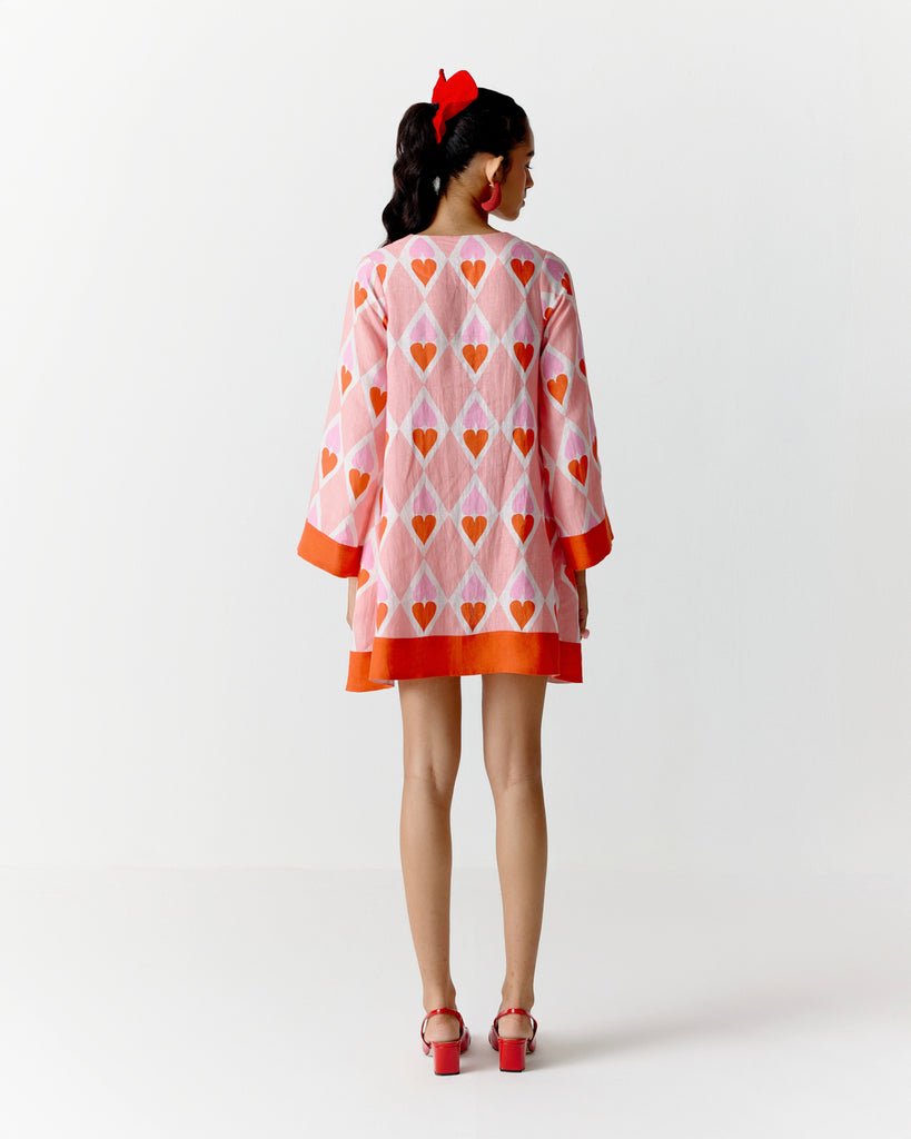 The Pink Hearts Bell Sleeve Dress is a vibrant piece that instantly brightens your wardrobe. The dress features dramatic bell sleeves that add a bold retro flair. With a red color-blocked border along the edges, it creates a striking contrast that enhances the dress’s upbeat vibe. The kaftan-style silhouette drapes effortlessly over the body, offering a relaxed, flattering fit that’s easy and comfortable to wear. This dress is the perfect mix of fashionable, fun, and happy, making it ideal for those who want to exude positivity and style in one striking look.